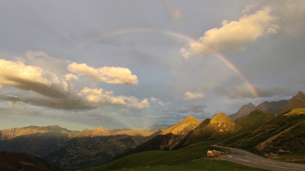 As I arrived the sun was shining through a stripe between the mountains and the clouds directly into my eyes. I was flashed by a huge light of beauty and compassion that was filling me with the most beautiful feeling I ever had. The winds were blowing me off my bike and when I turned my head around I saw this huge full circle of a rainbow. I couldn’t believe what was happening, I was riding this mountains and on the top I felt I was meeting the highest force of life herself…